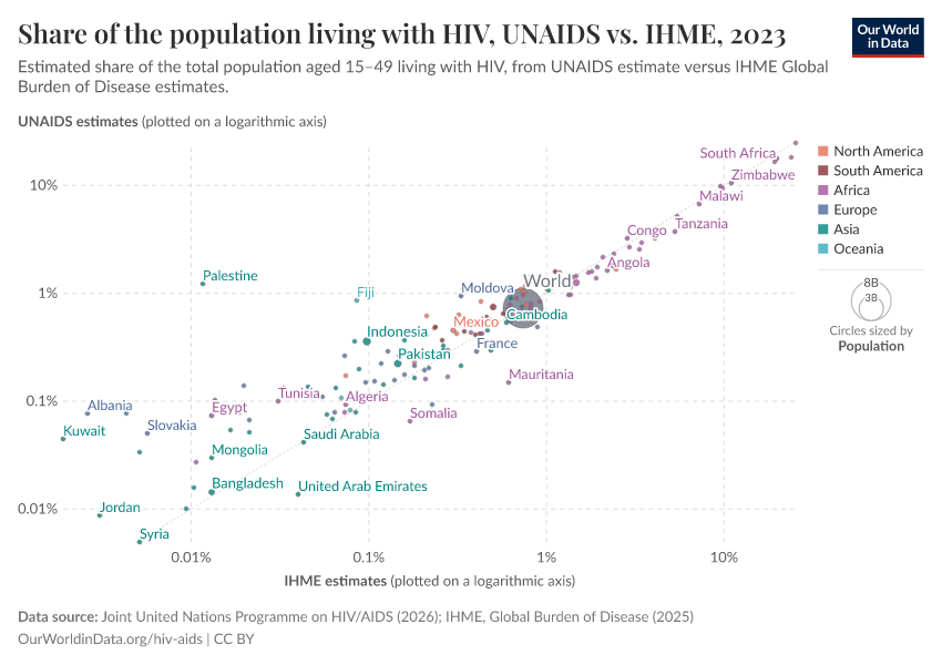 Several sources publish estimates on HIV and AIDS. Two of the most established sources, presented on this page, are UNAIDS and the Institute of Health Metrics and Evaluation (IHME). The charts below show a comparison of these two sources' estimates.