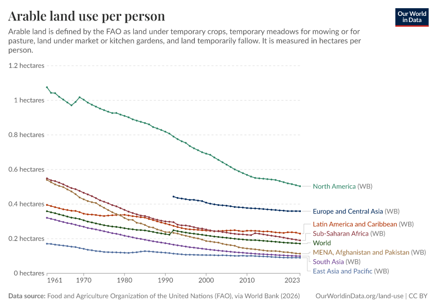 In the chart here we have plotted trends of the average arable land use per person across the world's regions. Overall, we see that the arable land use per capita has declined across all regions since 1961. Per capita land use is highest in North America — more than double the land use of any other region. Land use in Asia — both in South and East Asia is lowest (5-6 times less than in North America). Rates of reduction in South Asia have been the most dramatic; per capita land use in recent years is roughly one-third of its value in 1961.