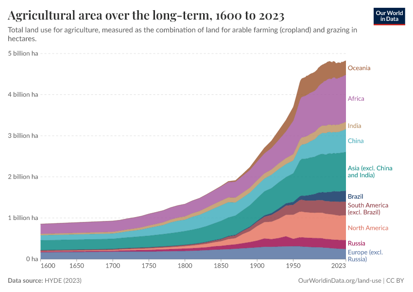 This visualization shows the total land used for agriculture (which is a combination of cropland and grazing land) over the long term, measured in hectares. In the following sections, you can find disaggregated data on cropland and grazing land change over time.