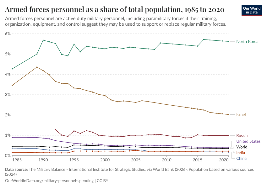 Esteban Ortiz-Ospina (2018) - “Long-run trends in military spending and personnel: four key facts from new data” Published online at OurWorldinData.org. Retrieved from: 'https://style-labor-employmentrate-c.owid.pages.dev:8789/20260202-181317/military-long-run-spending-perspective.html' [Online Resource] (archived on February 2, 2026).BibTeX citation