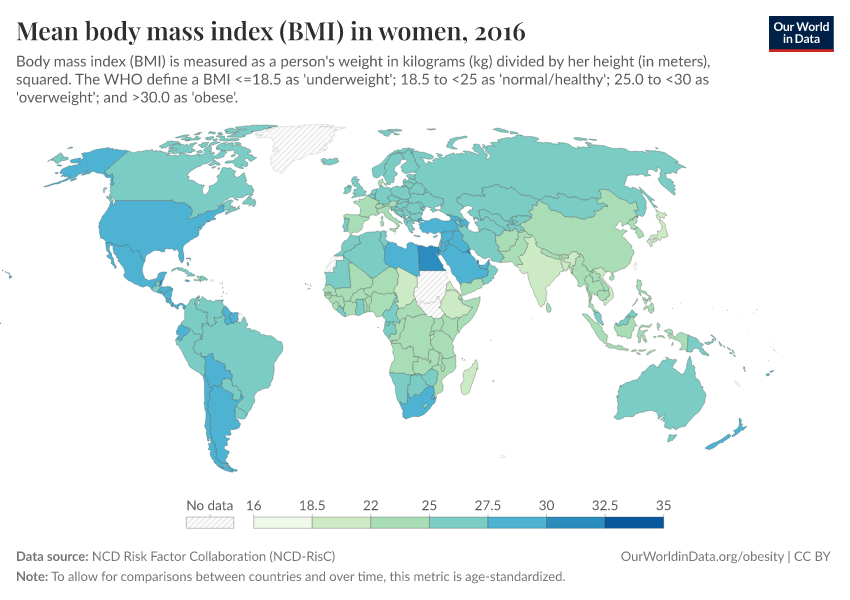 In the map, here we see the distribution of average (mean) BMI in adult women across the world.
