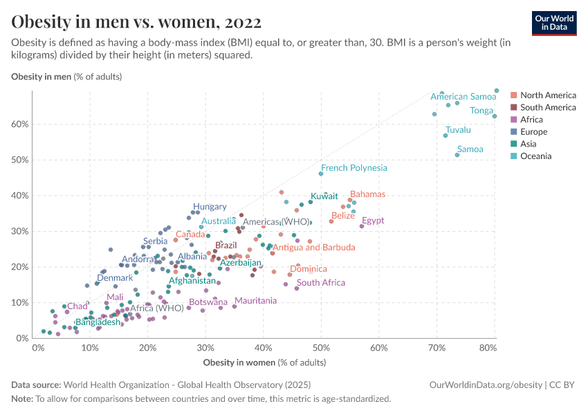 Overall we see a pattern roughly in line with prosperity: the prevalence of obesity tends to be higher in richer countries across Europe, North America, and Oceania. Obesity rates tend to be much lower across South Asia and Sub-Saharan Africa.