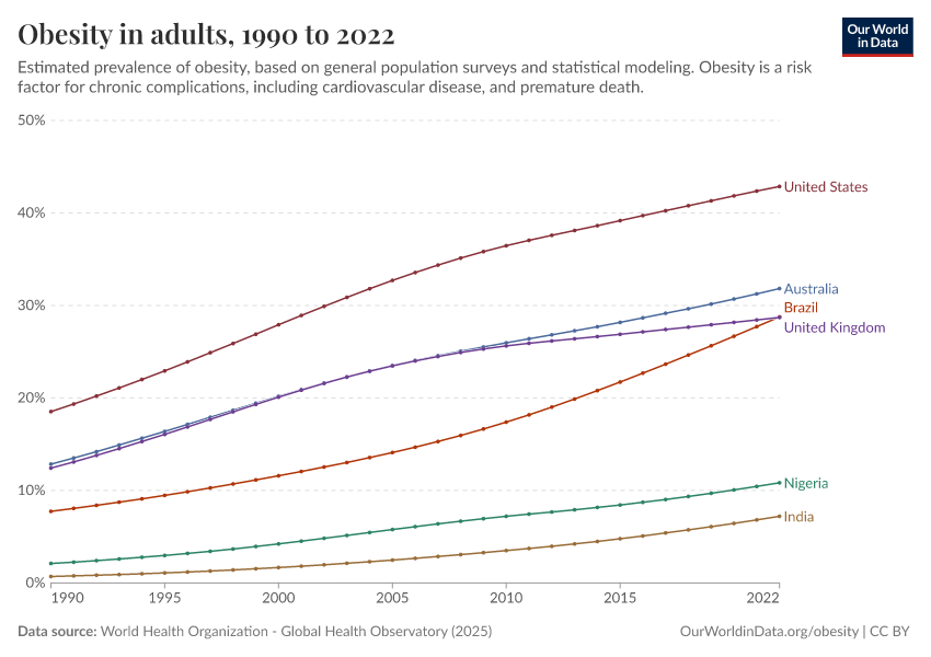 On this page, you will find global data and research on obesity — its prevalence, drivers, health consequences, and trends over time.