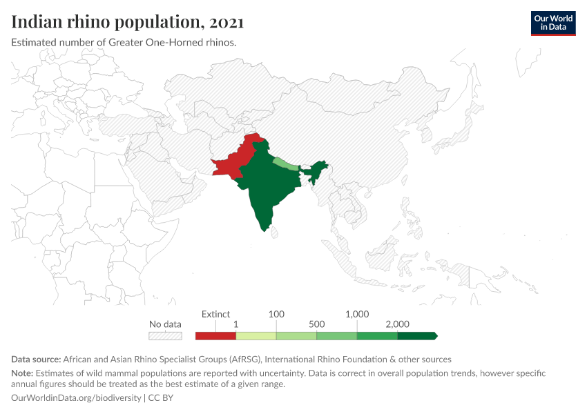 By the mid-20th century, there were very few Indian Rhinos left in the world. It’s estimated (with larger uncertainty since it predates regular surveying) that there were only 40 individuals left.