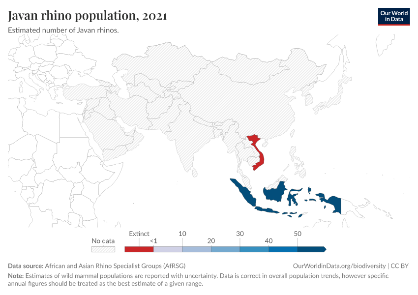 Its total population has, however, increased from 50 years ago. In the 1960s there were only 20 to 30 Javan Rhinos left in the world. From then until the 1990s, the population approximately doubled. The latest estimate puts this figure at 76 Javan Rhinos.
