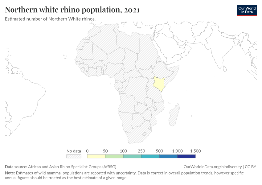 In the chart we see its demise over the second-half of the 20th century. In 1960, it’s estimated there were more than 2,000, predominantly in Sudan and the Democratic Republic of Congo. Intense poaching, and challenges for protection during civil unrest in stronghold countries, has led to a rapid decline.
