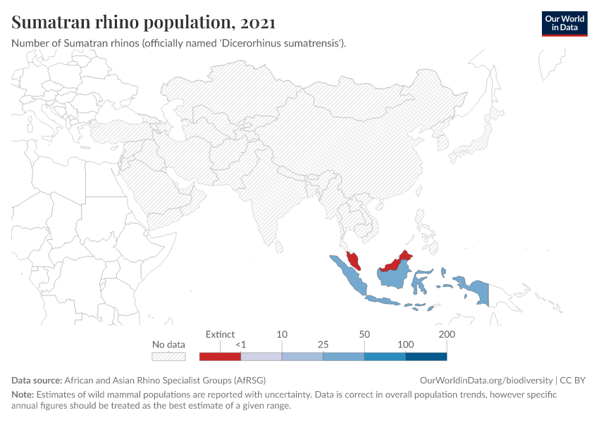 Once found in both Malaysia and Indonesia, the Sumatran Rhino is thought to be extinct in Malaysia; none have been recorded in 2016 and 2018 surveys.