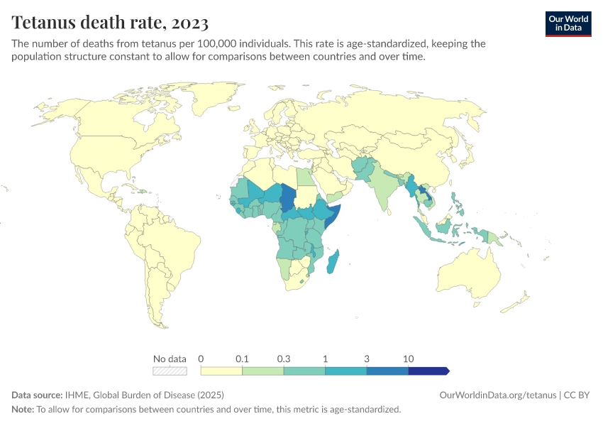 This is given as the rate of tetanus deaths per 100,000 people in the population, and is age-standardized to allow for comparisons between countries and over time.