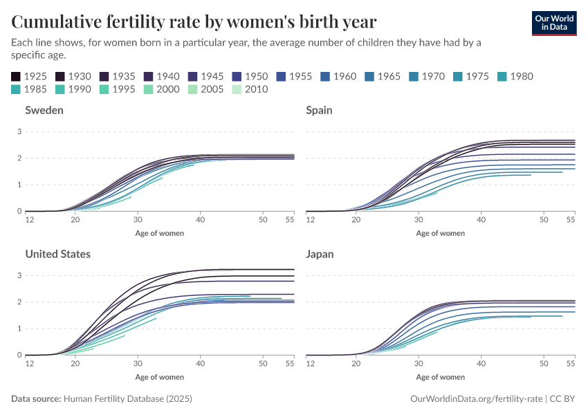 Saloni Dattani and Lucas Rodés-Guirao (2025) - “Why the total fertility rate doesn’t necessarily tell us the number of births women eventually have” Published online at OurWorldinData.org. Retrieved from: 'https://style-labor-employmentrate-c.owid.pages.dev:8789/20260225-014904/total-fertility-rate-births-per-woman.html' [Online Resource] (archived on February 25, 2026).BibTeX citation