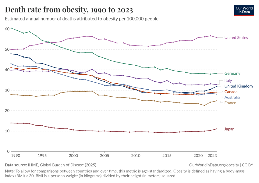 Obesity is a key risk factor for many of the leading causes of death in rich countries, including heart disease, diabetes, some cancers, and stroke.3 Estimates of the death rate from obesity-related factors in the US are higher than for other countries as the chart shows. To improve population health it will be key for all countries to make progress against obesity, for the US it is especially important.